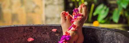 Attractive Young woman in bath with petals of tropical flowers and aroma oils. Spa treatments for skin rejuvenation. Alluring woman in Spa salon. Girl relaxing in bathtub with flower petals. Luxury BANNER, LONG FORMAT