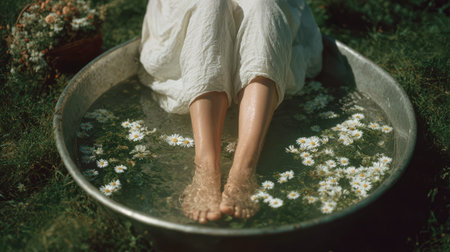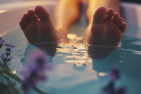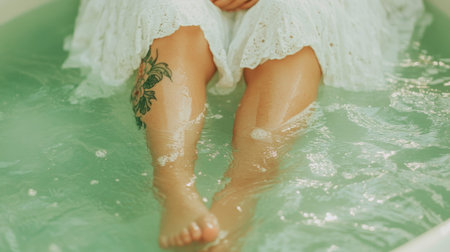 legs of a girl in a bath with lotus leaves