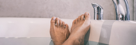 Bath woman relaxing in bathtub at home with view of feet soaking in hot water banner panorama.