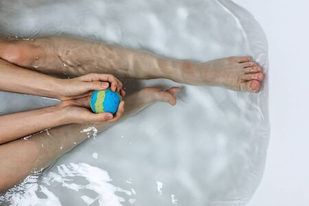 Above shot of woman's legs and hands holding bath bomb in a tub, bodypositive of self care concept