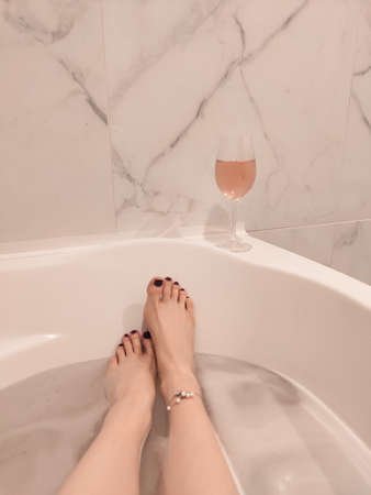 Woman with glass of wine in bath. Sunday relax concept