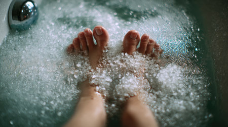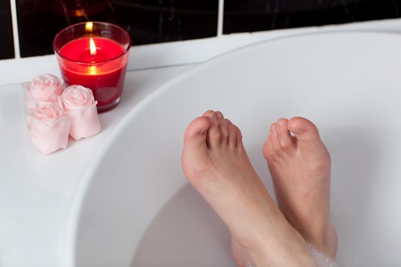 elegant feet with red nail polish of the model while relaxing in the tub with lots of bubbles