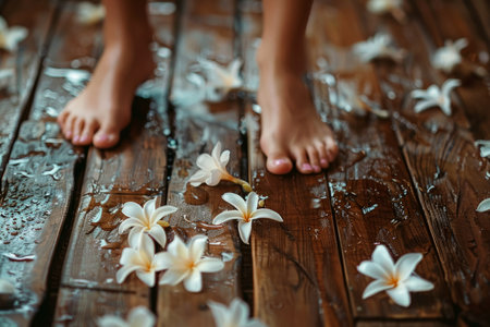 girls feet standing on the edge of the white tubs of water with petals
