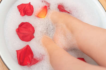 Woman feet in water with soap foam and rose petals close up with selective focus. Spa treatment for dry feet skin. Homemade bath soak for female feet and hand. Skin care concept. Luxurious lifestyle