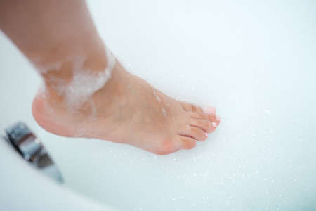 Close-up of a female foot in foam. Girl enters the bubble bath, top view