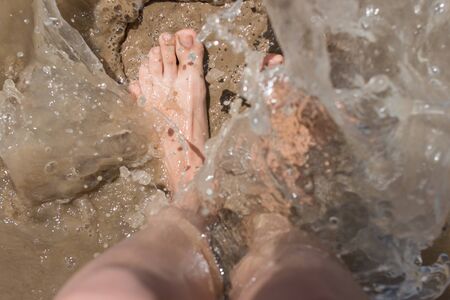 closeup feet in the water, with wave of ocean sea light with cooling tone.