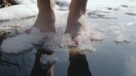 Unrecognizable young woman is dipping her foot in cool water of pond, refreshing and hardening concept.