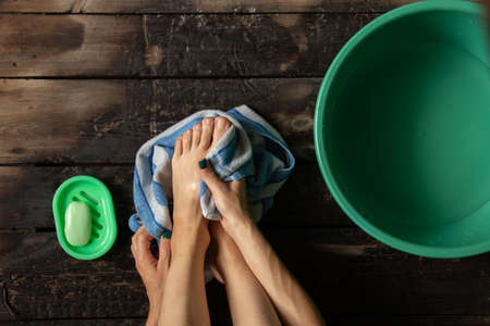 Women's feet in a basin of water on a dark wooden floor and a towel, home foot washing procedure, hygiene and body care, top view