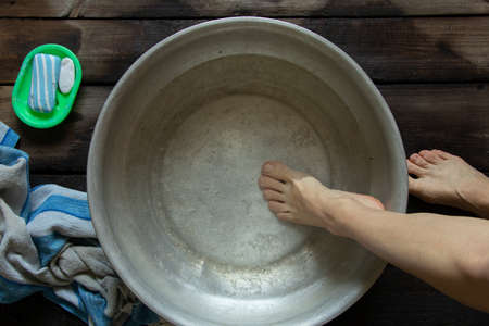 girl washes her feet in a basin of water on the wooden floor at home, foot care, wash feet at home, hygiene, swim in a bowl