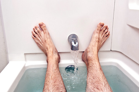Selective focus on hairy male legs in a bath of water. View from above.
