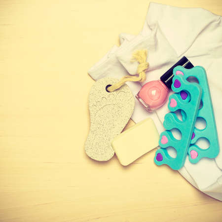 Foot care. Pedicure accessories set tools on wooden board background top view with copy space