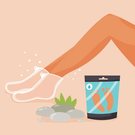 Legs with foot mask. Packaging with cosmetic spa products for women. modern vector flat illustration