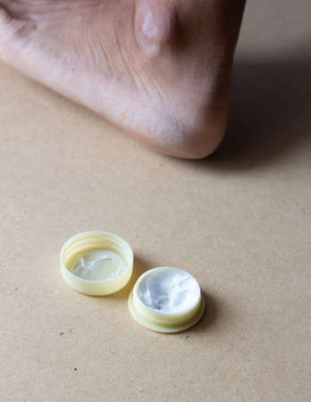 applying cream on the feet sole for the treatment of corn, callus, callosity, cracks, softening the skin, cosmetic procedures