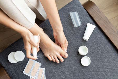 Tired woman using pain relief cream for foot after fatigue, long walking, working, standing, flat feet or injury, sitting indoors. Suffering from hurt of arch, ball, heel or toe treatment