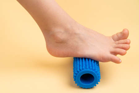 blue needle roller for massage and physiotherapy on a beige background with the image of a childs foot, the concept of prevention and treatment of hallux valgus