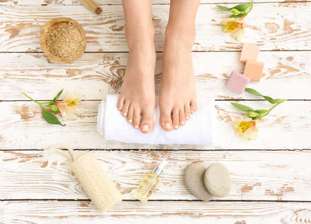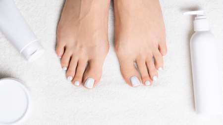 Female feet with white glossy pedicure on terry towel among jars and cans of cream, flat lay.
