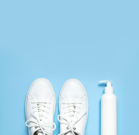 White leather sneakers, plastic bottles of cleaning products for shoes on blue background flat lay top view. Natural leather shoe care, spray, foam, shoe deodorant, cosmetic shoe products.