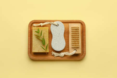 Wooden board with soap bar, pumice and massage brush on color background
