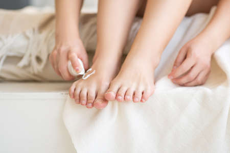 Close-up of young woman sites on the white sofa in the living room and painting her toenails in red.