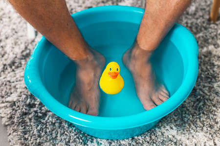 Man soaking his feet in a plastic basing and relaxing, a rubber duck is floating on the water
