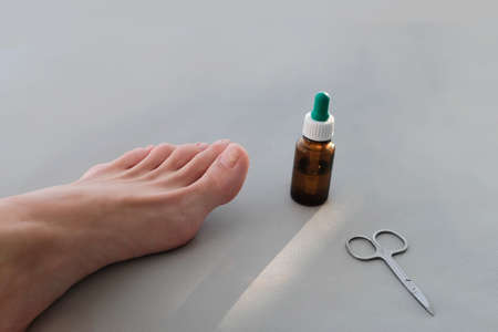 A close-up of a foot with a fungus on the nails. Onycholysis: detachment of the nail from the nail bed.