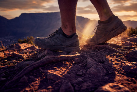 close-up of hiking boots on a trail at sunset