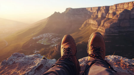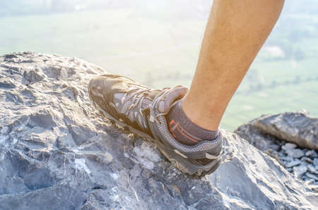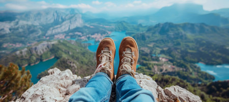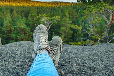 Close up of hiker resting on rocky cliff in hiking shoes, symbol of adventure, outdoor lifestyle, challenge, exploration, determination, nature journey and freedom in mountain travel.