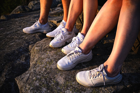 Close up view of three pairs of legs in white sneakers in nature at sunset