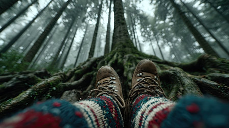 Feet in the rain forest with woolen socks and old tree