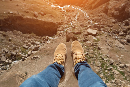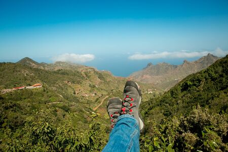 Legs of traveler in hiking shoes sitting on high mountain cliff enjoying scenery mountain. Travel, freedom, trekking and hiking concept. Stock photo
