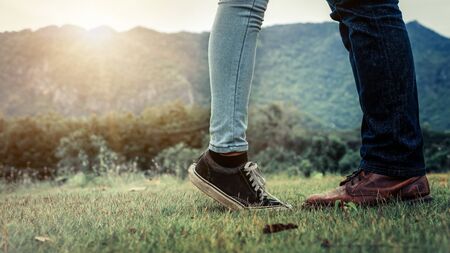 Man with sneakers and barefoot girl are enjoying their holiday evening