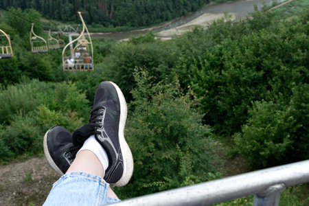 Going down from mountain top on cableway. Person legs and cable car seat, funicular over green mountain valley, top view. Active tourism and sport.