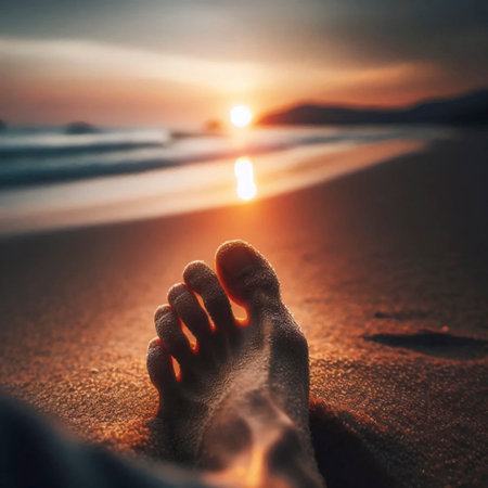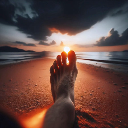 From a first-person perspective, a hiker takes a well-deserved rest on a grassy cliff, their boots pointing towards the magnificent view. Below, waves crash against the rugged coastline as the setting sun casts a warm, golden glow over the water, creating a moment of pure serenity and connection with nature.