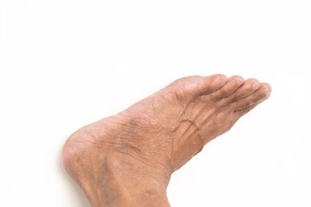 Dry, rugged and worn-out feet of an elderly man on a white background
