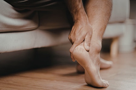 A close-up image of a person sitting on a couch, holding their foot in apparent pain. The focus is on the foot and the person's hand gripping it.