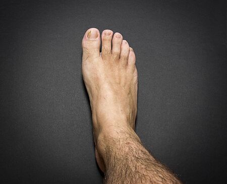 2 feet are standing on the old Rough floor is made from cement, concrete and sand. It has a hard , dirty and damage surface. white ruined industrial brick wall with copy space.