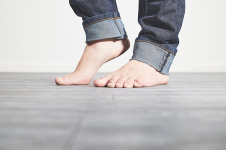 Legs in gray lace-up sneakers and blue jeans standing on the asphalt, top view.