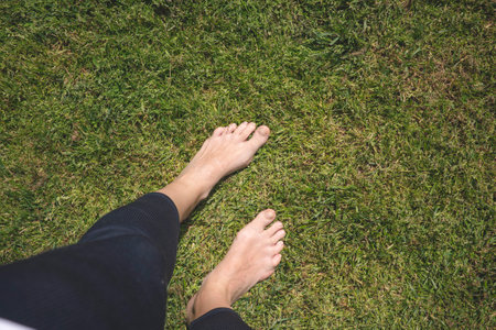 Close-up of barefoot legs walking in nature. Concept of healthy feet.