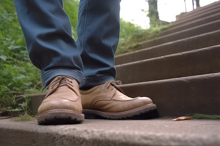 Close-up of a mans polished brown formal shoes ascending a flight of concrete steps, symbolizing progress and determination