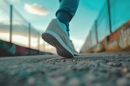 Close-up of a person s shoes as they walk up metal stairs illuminated by a warm sunset glow. Symbolizes progress, ambition, and moving forward.