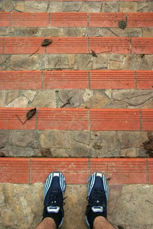 Person in sports shoes ready to go down some park steps