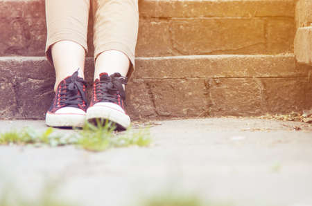 Woman in sneakers going up stairs outdoors, closeup