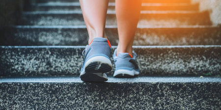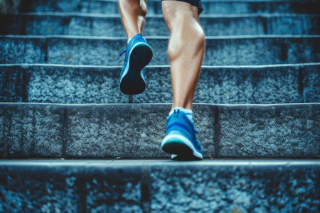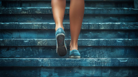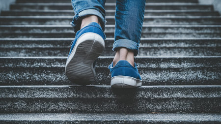 A person is walking up a set of stairs in their white shoes. Concept of determination and focus as the person climbs the steps