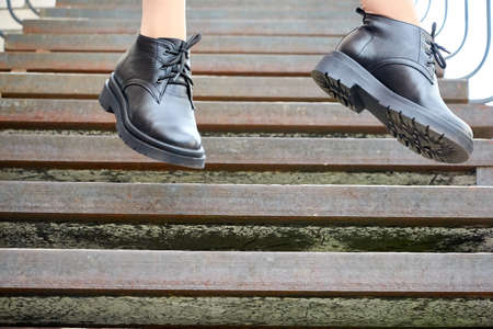 Close up of woman legs walking up stairs in the city. Selective focus.