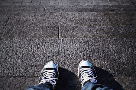 Step up your style. POV shot of a person wearing sneakers standing on steps.