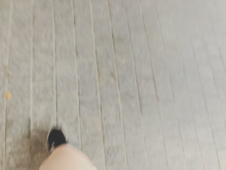 Legs in white sneakers and black pants walking down steps, top view