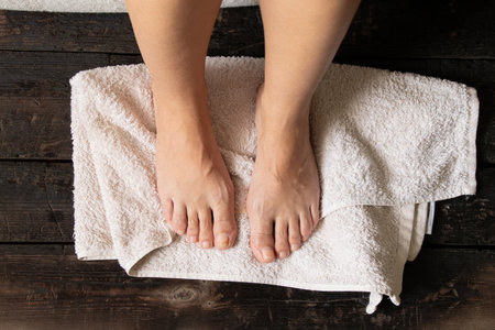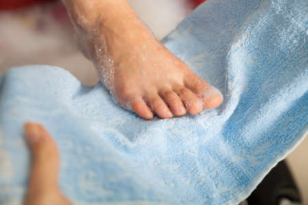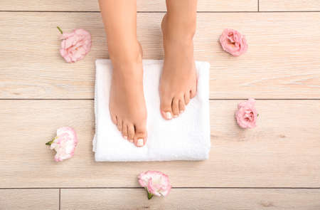 Clean female feet after washing stand on a white towel on a wooden floor, hygiene and foot care at home