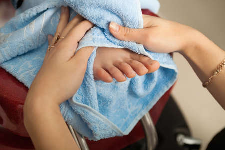 Newborn Baby's Tiny Foot Wrapped in Soft Cloth.