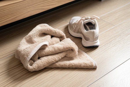 cropped shot of a pair of running shoes and a towel on the floor, created with generative ai