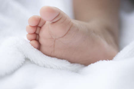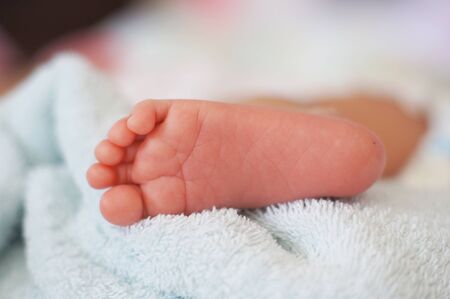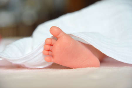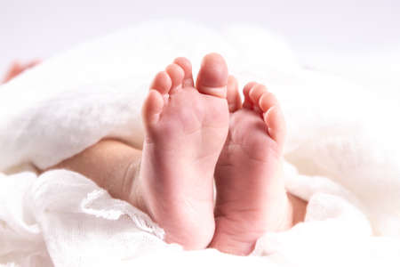 Bare feet of a cute newborn baby in warm white blanket. Childhood. Small bare feet of a little baby girl or boy. Sleeping newborn child.